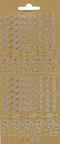 Art.code: 1143-1 Zur Konfirmation - Peel- Off Stickers Sheet Colou...Zur Konfirmation - Peel- Off Stickers Sheet Colour: Gold Size: 10 x 23cm - 3.9 x 9.1in Available in colours: Gold-1 Acid free German language Peeloffs are outline hobby stickers of the best quality a... Read moreMore infomation -