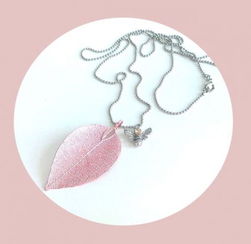 Art.code: 12415-1101 Necklace with Leave and Bee Colour: silver c...Necklace with Leave and Bee Colour: silver colored Handmade Real Pink Leave - 2,5 x 2,5cm Necklace with Lobster clasp -1,6mm x 80cm Bee Pendant - 16,3 x 15,7cm Packed in luxury Organza Bag and G... Read moreMore infomation