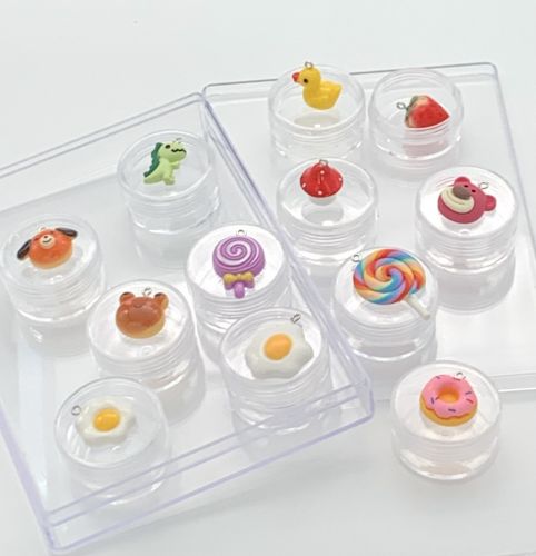 Have' em all: 12 cute Toy Charms in a box, starring dino, duck. Beer, dog, frog, donut, strawberry, lollipop rainbow,lollipop purple, sunny side up egg small, Sunny side up egg medium, mushroom
