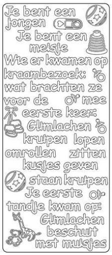 Code de L’article: ST-1702-1 Scrapbook Babyteksten - Peel- Off Auto Collants C...Scrapbook Babyteksten - Peel- Off Auto Collants Couleur: Or Format: 10 x 23cm Disponible en couleurs: Or-1, Multi-3 Sans acide Egalement appelés autocolants 'contours', les peel off's s'utilisent po... Description longuePlus d’informationConnectez-vous ou Inscrivez-vous pour ajouter des produits à vos favoris. -